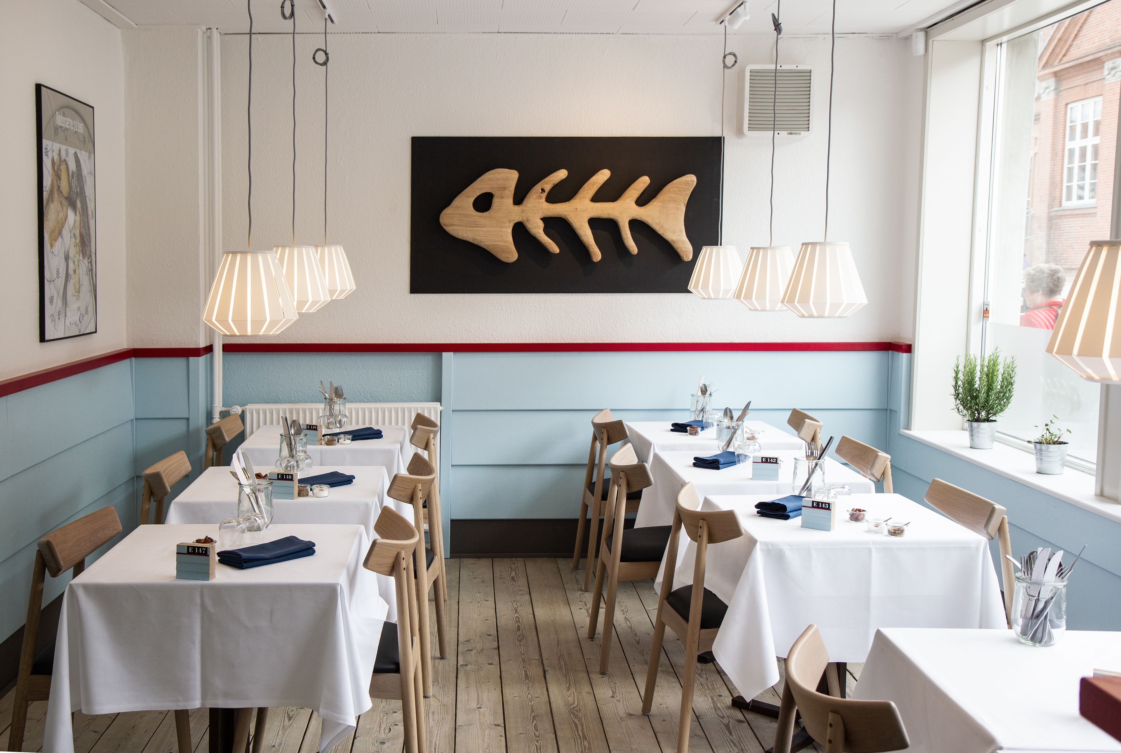 Senest blev der designet og leveret specialborde til hele restauranten. Fiskebenet er CNC fræst ned i pladen efterfølgende malet, slebet let og bordpladen er herefter planslebet inden hvidoliering.